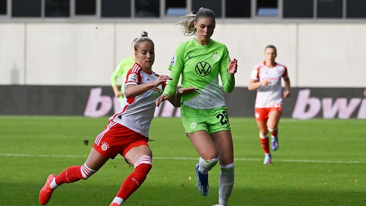 Bayern Münchens Giulia Gwinn im Zweikampf mit Jule Brand vom VfL Wolfsburg.