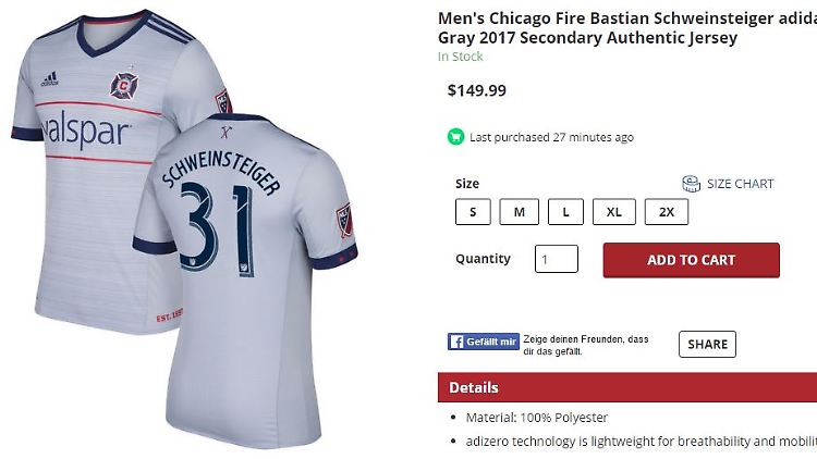 21.03.2017, 17:04 UhrHaben Sie zufällig 140 Euro übrig? Und wissen nicht, in was Sie die investieren sollen? Und sind zufällig Fan von Bastian Schweinsteiger? Dann haben wir einen Tipp für Sie: Chicago Fire bietet bereits Trikots mit der traditionellen Schweinsteiger-Rückennummer 31 an.