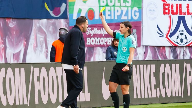 Katrin Rafalski zeigt Leipzigs Trainer Saban Uzun den Gelben Karton.