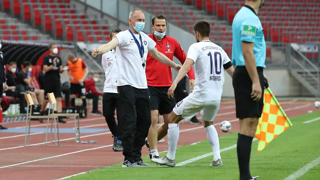 Mittelfeldspieler Dimitri Nasarow vom Fußball-Zweitligisten Erzgebirge Aue hat um Nachsicht für seinen innigen Jubel mit Teambetreuer Thomas Romeyke gebeten. Nach seinem Führungstreffer im Auswärtsspiel beim 1. FC Nürnberg (1:1) am Freitag hatte Nasarow den Betreuer innig umarmt. Laut Hygienevorschriften der Deutschen Fußball Liga (DFL) sollen solche Jubel in Zeiten der Corona-Krise aber vermieden werden. "Der Torjubel ging ganz klar an unseren Busfahrer. Er hat uns das Leben gerettet. Ohne ihn, wenn er nicht so schnell reagiert hätte, wer weiß was passiert wäre", sagte Nasarow im MDR. Der Mannschaftsbus der Sachsen war bei der Anreise nach Nürnberg in einen heftigen Verkehrsunfall verwickelt worden. Dabei wurde er von Trümmerteilen eines verunglückten PKW getroffen. Der Bus, in dem die Mannschaft und das Trainer- und Betreuerteam saßen, kam am Fahrbahnrand noch rechtzeitig zum Stehen. "Ich hoffe, dass die DFL ein Auge zudrückt. Ich weiß, man darf das nicht. Ich hoffe, das versteht jeder. Da muss man auch mal ein bisschen Menschlichkeit zeigen", sagte Nasarow.