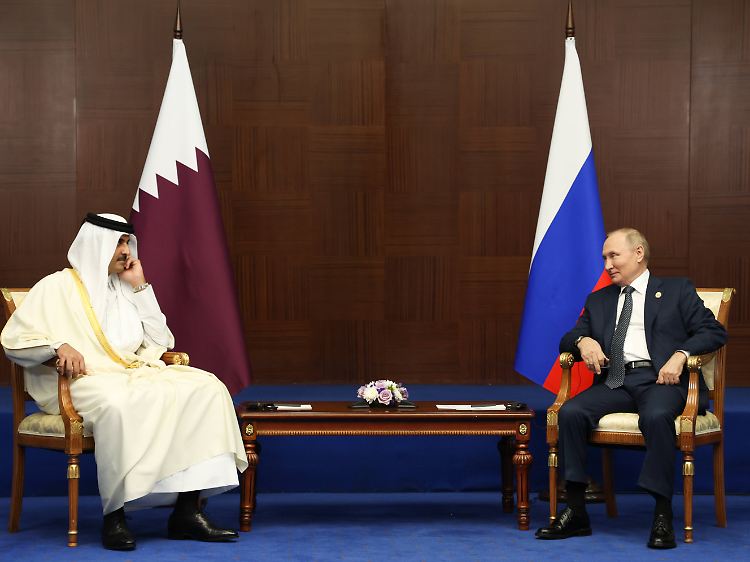 13.10.2022, 12:07 UhrIn gut einem Monat beginnt die WM in Katar. Vorher aber findet in Astana die Konferenz für Zusammenarbeit und vertrauensbildende Maßnahmen in Asien (CICA) statt. Dort werden auch Pläne für das Fußballturnier geschmiedet - und zwar in Zusammenarbeit mit Wladimir Putin. Der russische Machthaber kam mit dem Emir Katars, Tamim bin Hamad Al Thani, für ein Vieraugengespräch zusammen. Im Anschluss verkündete die staatliche Nachrichtenagentur Katars QNA, Russland biete "große Unterstützung" für den Wüstenstaat in Bezug die WM an. Die "Koordination" würde demnach "fortgesetzt, und wir danken Russland dafür."