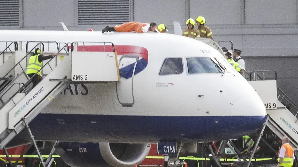 Der Anklage zufolge war Brown, als Passagier gelistet, plötzlich auf eine British-Airways-Maschine geklettert und hatte seine Hand mit Superkleber an der Außenhülle befestigt. Fotos zeigen ihn bäuchlings auf dem Flieger, der nach Amsterdam abheben sollte.