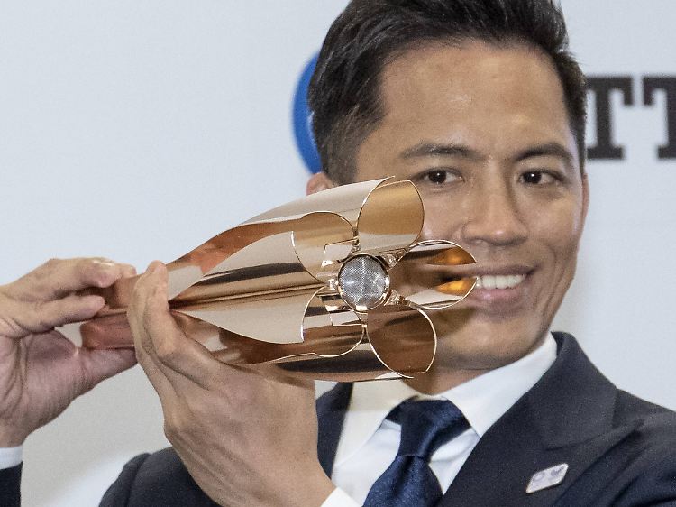 - Judoka Tadahiro Nomura präsentierte in Tokio die Fackel, die am Flammenaustritt mit fünf Blütenblättern einer Kirsche verziert ist.