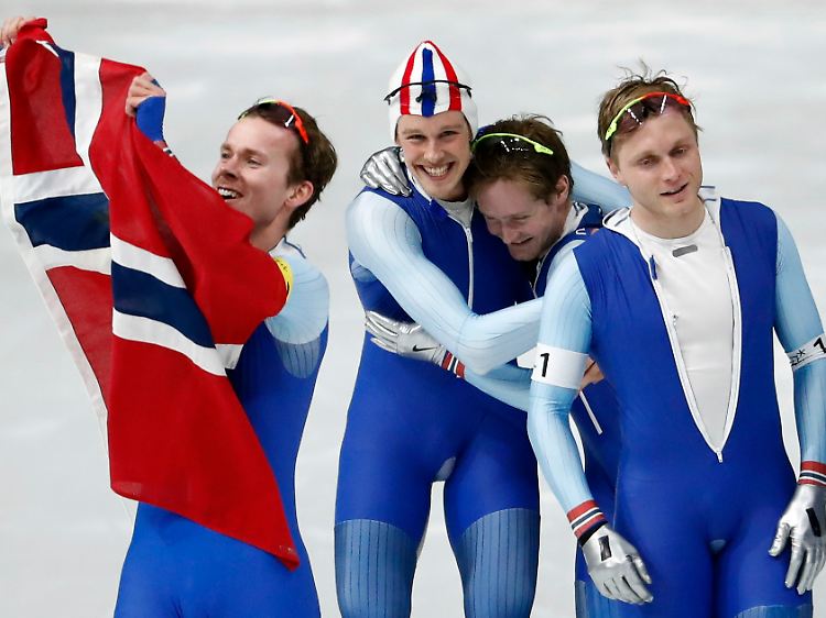 Sindre Henriksen, Havard Bokko, Simen Spieler Nilsen und Sverre Lunde Pedersen sind Olympiasieger in der Teamverfolgung im Eisschnelllauf.