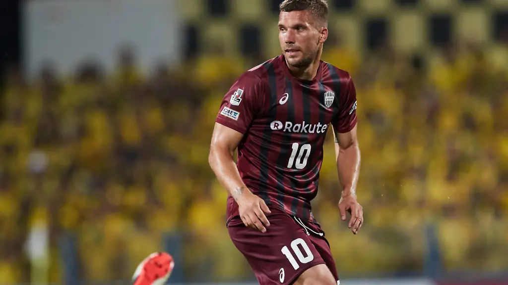 In der 43. Minute des Ligapokal-Viertelfinales gibt's eine Standardsituation für seinen Klub Vissel Kobe, Podolski wartet im Strafraum auf die Flanke und wird dabei von seinem Gegenspieler bedrängt.