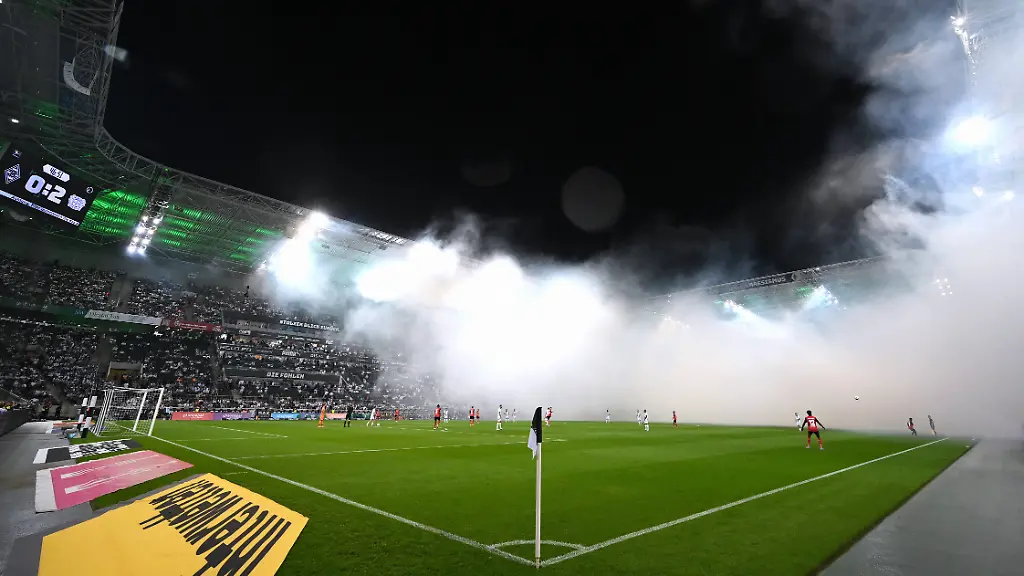 Über sechs Minuten ruht der Ball. Als sich die Schwaden noch nicht immer noch voll verzogen haben, setzt Schiedsrichter Robert Schröder die Partie fort. Die Aufholjagd der Borussia kann also, leicht verspätet, starten.