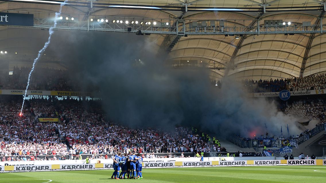 09.04.2017, 14:12 UhrDas muss nun wirklich nicht sein: Aus dem KSC-Fanblock abgefeuerte Leuchtraketen führen zu einer kurzzeitigen Unterbrechung des Zweitliga-Derbys beim VfB Stuttgart. Nachdem zum wiederholten Male ein Feuerwerkskörper auf dem Fußballfeld der Mercedes-Benz Arena gelandet war, unterbricht Schiedsrichter Christian Dingert die Partie in der 18. Minute für wenige Sekunden. Schon vor dem Anpfiff hatten Karlsruher Anhänger etliche Böller gezündet und Bierbecher auf VfB-Fans geworfen. Die Partie ist als Hochrisikospiel eingestuft worden.