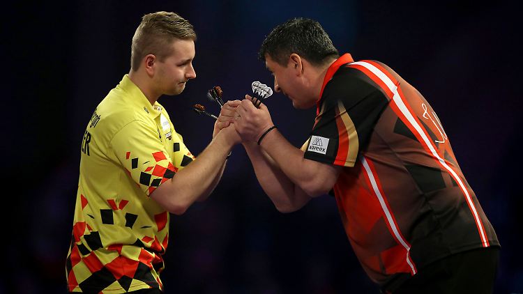 Mensur Suljovic (r.) war im WM-Achtelfinale chancenlos gegen den Belgier Dimitri van den Bergh.