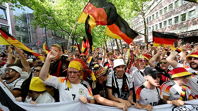 "Wir sehen gut gelaunte Fans, die sich auf das Fußballspiel am Abend freuen", sagte ein Sprecher der Polizei. Die Lage sei bislang friedlich. Bis zu 43.000 Menschen können im Westfalenpark auf mehreren Leinwänden gemeinsam Fußball schauen. Bislang gehen die Verantwortlichen bei der Stadt davon aus, dass die durch Deutschland ziehenden Unwetter die Ruhrgebietsstadt erst nach dem Spiel erreichen dürften.