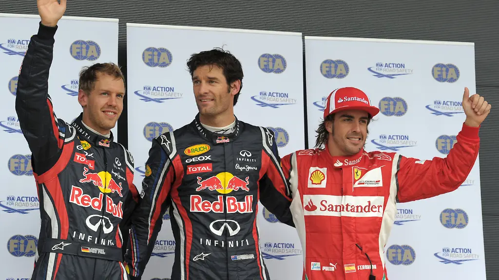 Die leidige Debatte um den diesmal verbotenen aerodynamischen Kniff mit dem Zwischengas-System beirrte die Red Bulls auf der Strecke zunächst nicht. Webber schnappte Vettel am Samstag um einen Wimpernschlag die Pole Position weg, musste sich im Rennen aber schon nach wenigen Metern hinter dem Deutschen einreihen. Vettel brauste auf nasser Strecke auf und davon, der Australier behauptete mit Mühe Rang zwei vor Alonso.