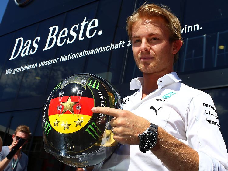 Sebastian Vettel warf einen neugierigen Blick auf Nico Rosbergs "WM-Helm" und schüttelte den Kopf: Weil der Fußballweltverband Fifa dem Mercedes-Piloten nicht erlaubte, ein Bild des WM-Pokals zu tragen, müssen nun vier Sterne und die Deutschland-Flagge als Hommage an den Triumph der Löw-Truppe in Brasilien genügen.
