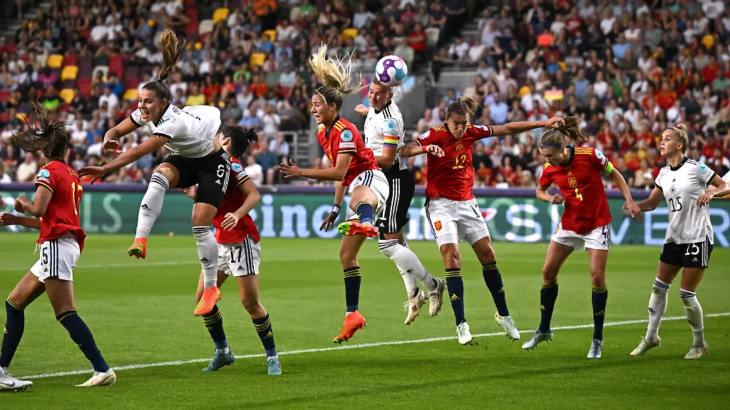 Mit einem Turbo-Tor und gnadenloser Effizienz sind die deutschen Fußballerinnen vorzeitig als Gruppensieger ins EM-Viertelfinale gestürmt. Vier Tage nach dem Traumstart gegen Dänemark (4:0) gewann der achtmalige Titelträger dank einer erneut beeindruckenden Teamleistung 2:0 (2:0) gegen Mitfavorit Spanien. Klara Bühl (3.) nach 138 Sekunden und Kapitänin Alexandra Popp (37.) trafen für die Mannschaft von Bundestrainerin Martina Voss-Tecklenburg, die am Samstag beim bedeutungslosen Vorrundenabschluss gegen das bereits ausgeschiedene Finnland Kräfte schonen kann. Deutschland blieb auch im siebten Duell mit Spanien ohne Niederlage.