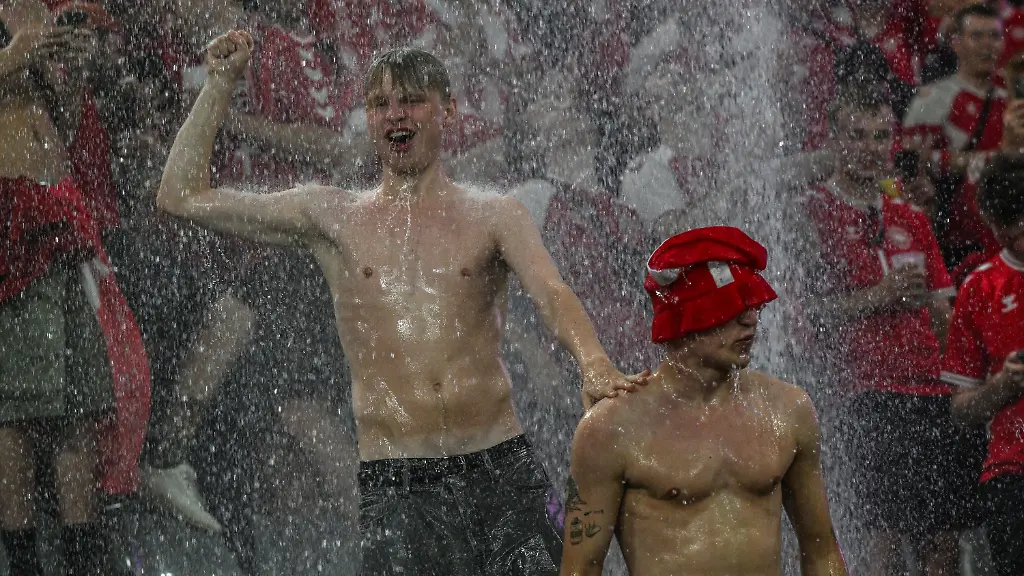 Die Stimmung der über 60.000 Fans auf den größtenteils überdachten Rängen blieb allerdings entspannt. Laut sangen sie "Oh wie ist das schön, so was hat man lange nicht gesehen", das ganze Stadion feierte. Zwei Dänen tanzten unter einem Wasserfall, der sich vom Stadiondach ergoss und wurden frenetisch gefeiert. Es waren ähnliche Szenen wie bei der Vorrundenpartie zwischen der Türkei und Georgien - auch da hatte es in Dortmund bereits extrem stark geregnet. Einige Fans versuchten, sich unter ihren Fahnen vor dem Regen zu schützen.