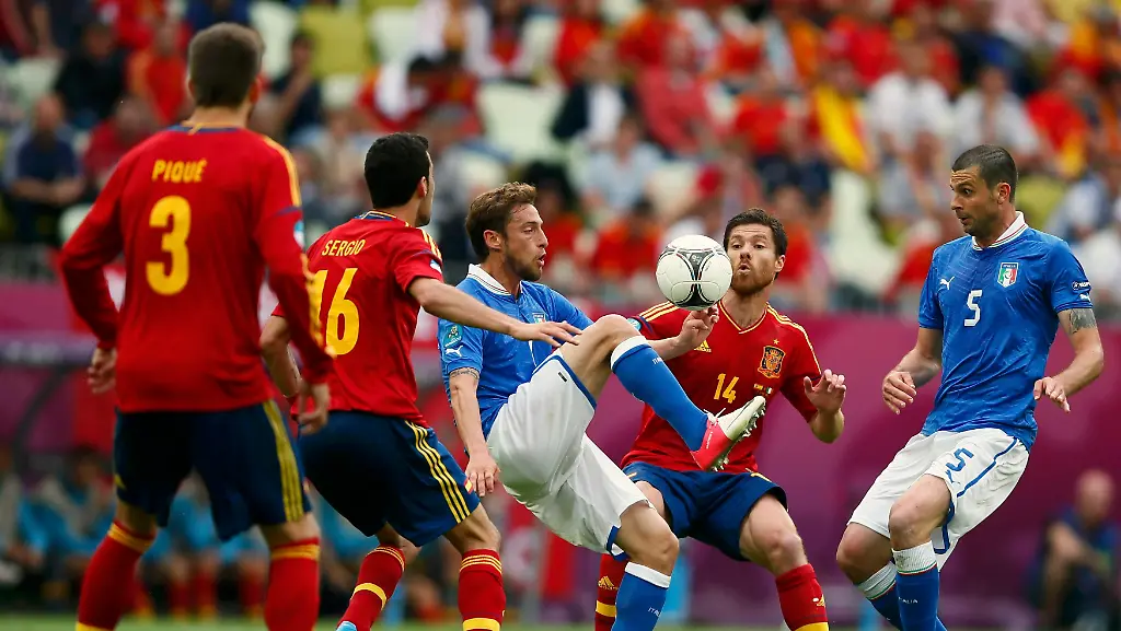 Die Spanier zogen ihr Kurzpass-Kunstwerk "Tiki taka" um Dreh- und Angelpunkt Xavi von Beginn an auf. Bei Italien führte Pirlo Regie. Der Welt- und Europameister mit zehn Spielern aus dem WM-Kader von 2010 in der Startelf setzte das erste Ausrufezeichen: Silvas (9.) Schuss ging aber klar übers Tor von Buffon. Italien hielt mit drei Weltmeistern von 2006 in der Anfangself dagegen.