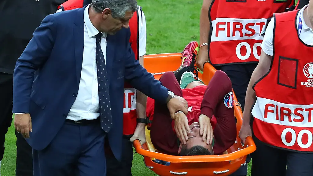 Doch nach 24 Minuten ließ er sich auf den Rasen des Stade de France fallen, zog die Kapitänsbinde vom Arm und bedeutete Schiedsrichter Mark Clattenburg, dass er nicht weitermachen könne. Der ließ eine Trage bringen, mit der Ronaldo vom Platz gebracht wurde. Für den portugiesischen Kapitän brachte Trainer Fernando Santos Ricardo Quaresma.