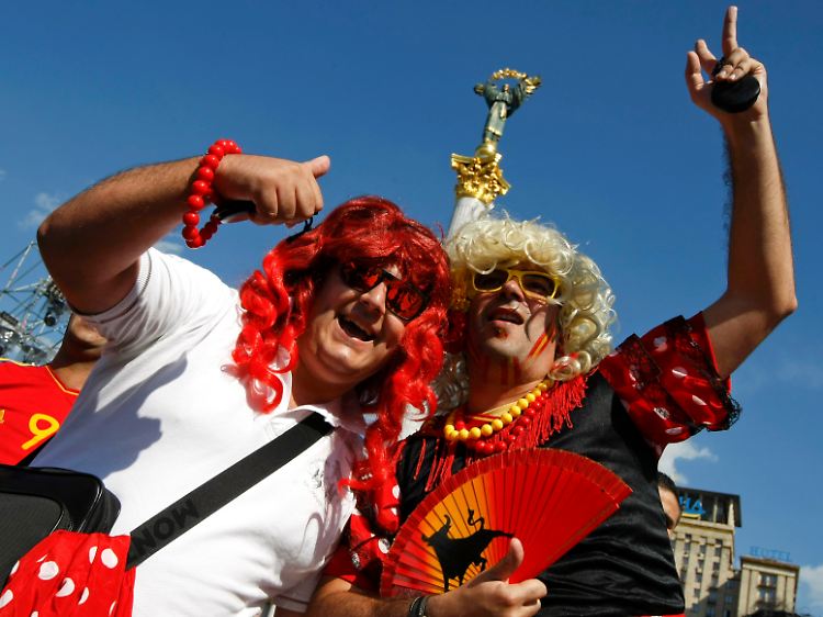 Die spanische Fußball-Nationalmannschaft kann im EM-Finale gegen Deutschland-Ernüchterer Italien einen historischen Titel-Hattrick perfekt machen - und will das ohne echten Stürmer in der Startelf schaffen. Das Fanduell haben die Iberer bereits gewonnen, die Farben Gelb und Rot dominieren in Kiew. Beim Abschlussfest zum Turnier glänzen ukrainische Kinder mit eigentümlichen Anzügen.