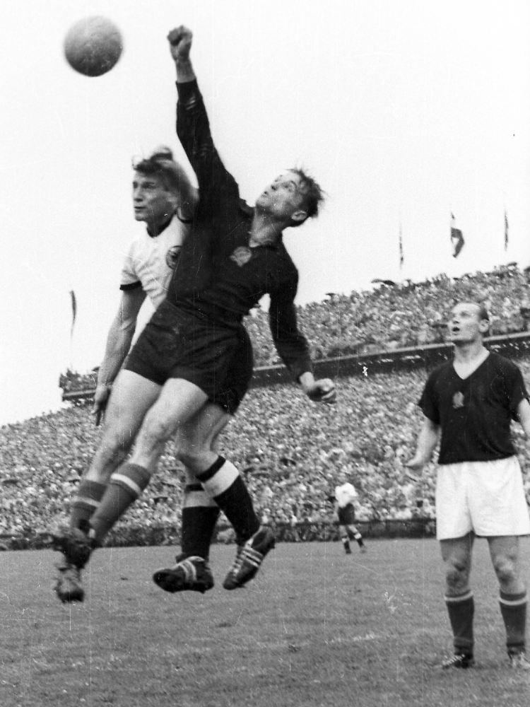 Im WM-Finale von 1954 duelliert sich Schäfer mit Ungarns Torwart Gyula Grosics.