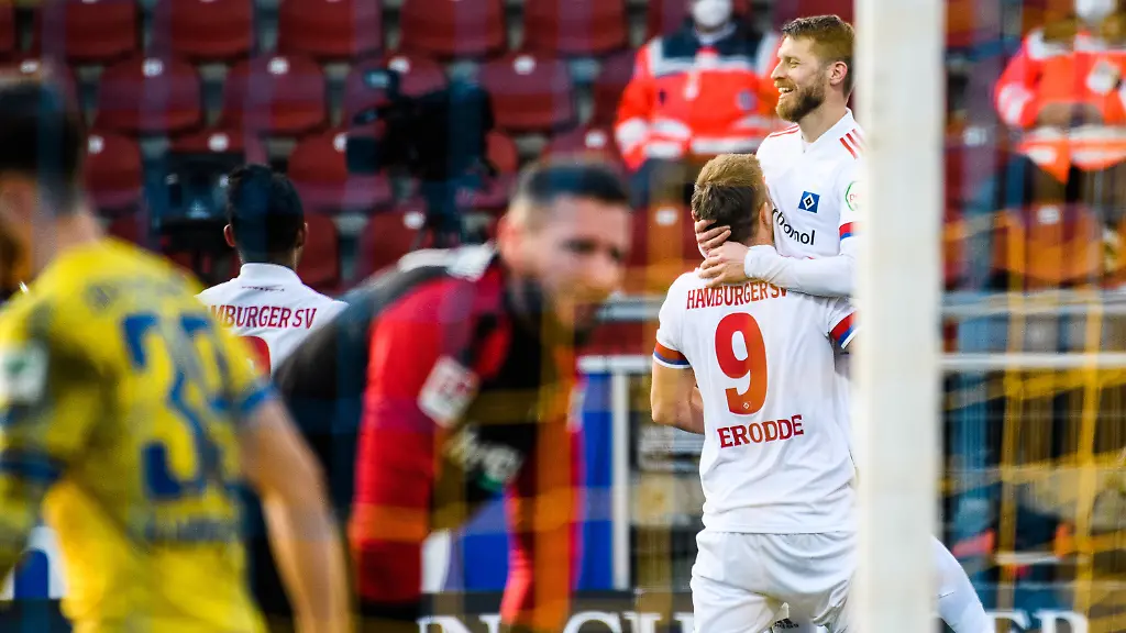 Felix Kroos (10.) und Marcel Bär (42.) hatten die Gastgeber, die weiter im Tabellenkeller liegen, in Führung gebracht. David Kinsombi (45.+2/65.), Toptorjäger Simon Terodde (51.) und Aaron Hunt (59.) waren für den HSV erfolgreich, der aus den vergangenen sieben Spielen 19 der möglichen 21 Punkte holte. Thioune vertraute auf die Formation, die am Montag 5:0 gegen Osnabrück gewonnen hatte, doch in Führung gingen die Gastgeber. Nach einem Einwurf konnte die HSV-Abwehr den Ball nicht klären, Kroos traf in der Folge aus kurzer Distanz.