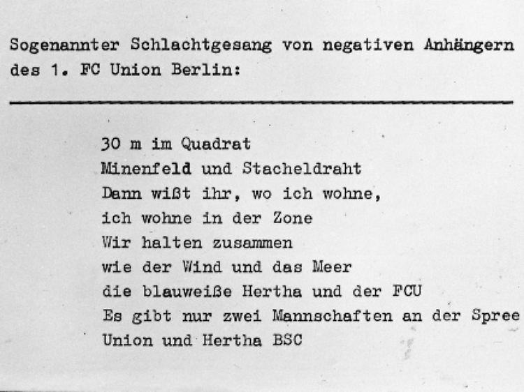 "Laut Information des Genossen Karl Zimmermann hat es eine Weihnachtsfeier zwischen den Vertretern des 1. FC Union und von Hertha BSC (West-Berlin) nicht gegeben. Durch die ständigen Organe wurde mitgeteilt, dass am 15.12.1985 in Pankow ein Treffen von besuchsweise in Berlin weilende West-Berliner, die sich als Mitglieder und Anhänger von Hertha BSC ausgegeben haben, mit angeblichen Mitgliedern des 1. FC Union stattgefunden hat. An diesem Treffen haben in Wirklichkeit weder Spieler noch andere Vertreter des 1. FC Union teilgenommen, sondern lediglich Anhänger des 1. FC Union. Nähere Angaben zu diesem Personenkreis liegen uns nicht vor."