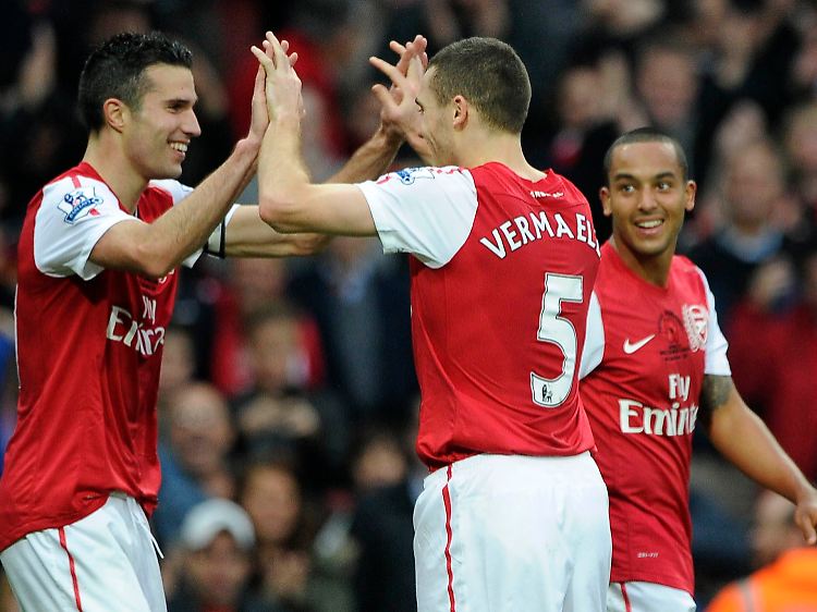 Robin van Persie (l.) erzielte das erste Tor selbst und bereitete die anderen beiden vor. Einmal legte er Thomas Vermaelen auf.
