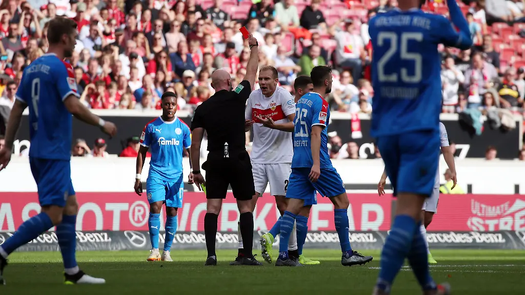 104 Sekunden vor dem Siegtor der Gäste durch Lee Jae Sung (55.) hatte Ex-Nationalspieler Holger Badstuber beim VfB wegen eines taktischen Foulspiels die Gelb-Rote Karte gesehen. Stuttgart könnte nach der Pleite gegen den Ex-Verein seines Trainers Tim Walter am Montag beim Topspiel von Arminia Bielefeld gegen den Hamburger SV (20.30 Uhr/Sky und im Liveticker auf n-tv.de) auf den dritten Tabellenplatz abrutschen. Danach geht es in Liga und Pokal innerhalb von drei Tagen zweimal gegen den HSV. Stuttgart bemühte sich gegen Kiel vor 54.176 Zuschauern, vergab jedoch die wenigen guten Torchancen. Silas Wamangituka traf nur die Unterkante der Querlatte (36.).