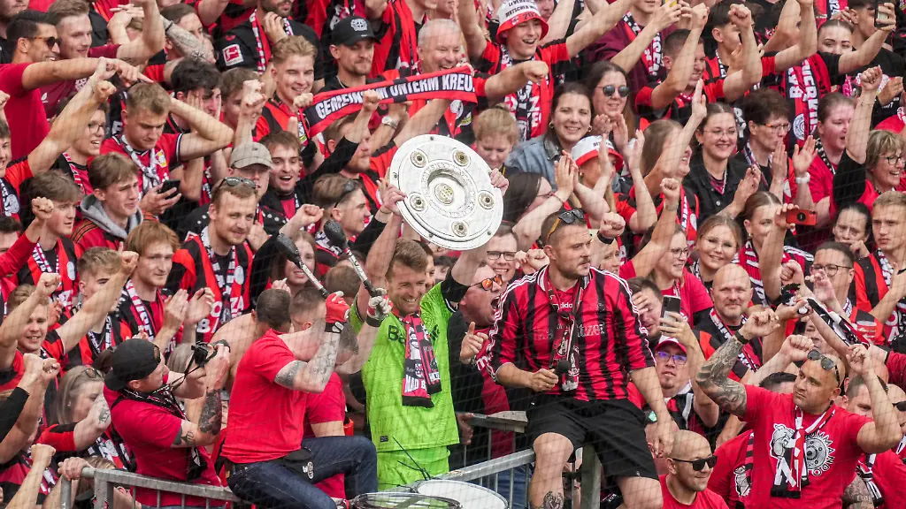 Für kurze Zeit war die Meisterschale im Getümmel verschwunden. Etliche Fans durften die Titelkrönung nach jahrzehntelangem Warten mit der Trophäe feiern, die Bayer Leverkusens Kapitän Lukas Hradecky im Feierrausch an die Anhänger in der Nordkurve weitergegeben hatte. Der Finne holte sich das begehrte Stück nach dem 2:1 gegen den FC Augsburg aber schnell wieder - und reckte sie weitere Male in die Höhe.