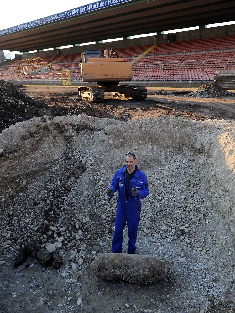 Über Jahrzehnte hinweg haben die besten Fußballer Deutschlands und der Welt in München auf tödlichem Untergrund gespielt. Im Zuge der gerade begonnenen Umbauarbeiten im altehrwürdigen "Städtischen Stadion an der Grünwalder Straße" wurde am Donnerstag bei einer gezielten Suche eine 225 Kilogramm schwere amerikanische Bombe aus dem Zweiten Weltkrieg entdeckt. Sie lag etwa eineinhalb Meter unterhalb der Grasnarbe in einem der Strafräume. Eine Kampfmittelbeseitigungs-Gruppe entschärfte die Bombe am frühen Abend.