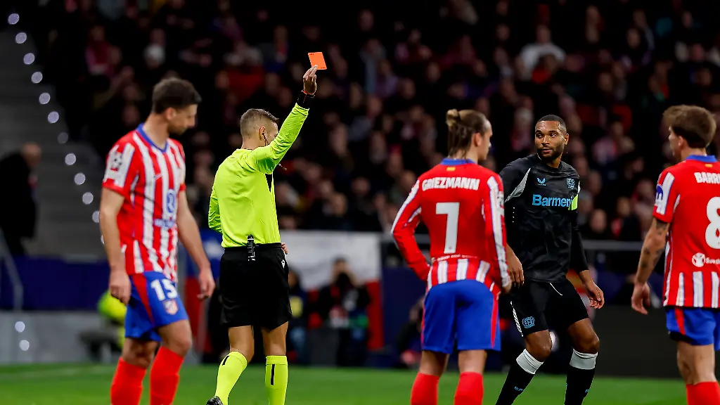 Wenig später dezimierte Atletico sich selbst: Barrios erwischte Nordi Mukiele mit gestrecktem Bein von hinten, Schiedsrichter Davide Massa zeigte nach Ansicht der Videobilder die Rote Karte. Die Partie wurde nun hitziger, Massa stand immer wieder im Mittelpunkt. Kurz vor der Pause belohnte sich die Werkself dann für einen couragierten Auftritt: Mukiele flankte auf den zweiten Pfosten, wo Hincapié ins lange Eck einköpfte.