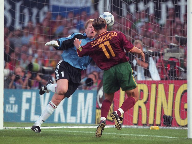 Fragen Sie nach bei Oliver Kahn! Der erlebte damals ganz bittere Momente. Der erste Treffer gelang Conceição per Kopf aus kurzer Distanz, er staubte ab, Kahn sprintete noch, kam aber zu spät und warf sich nur noch mit dem Portugiesen gemeinsam ins Tor. Der Ball war schon drin. Beim zweiten Tor zog Conceição von der Strafraumgrenze ab, Kahn bückte sich - und ließ den Ball zwischen Händen und Füßen durchrutschen. Miserable Werbung für sein Können. Beim dritten Treffer schloss Conceição von rechts ins lange Eck ab, ließ den deutschen Torhüter nur mit großen Augen auf dem Hosenboden sitzen.