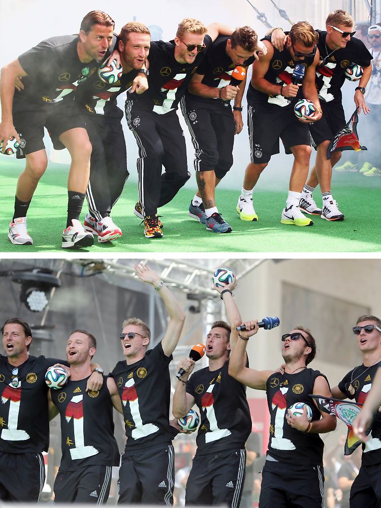 Angeführt von Vorsänger Klose hatten Torhüter Roman Weidenfeller, Shkodran Mustafi, André Schürrle, Final-Torschütze Mario Götze und der künftige Madrilene Toni Kroos bei der Siegerparty vor dem Brandenburger Tor einen beliebten Fangesang auf die unterlegenen Argentinier umgedichtet. In gebeugter Haltung sangen sie "So gehen die Gauchos", um später aufgerichtet hinzuzufügen: "So gehen die Deutschen".