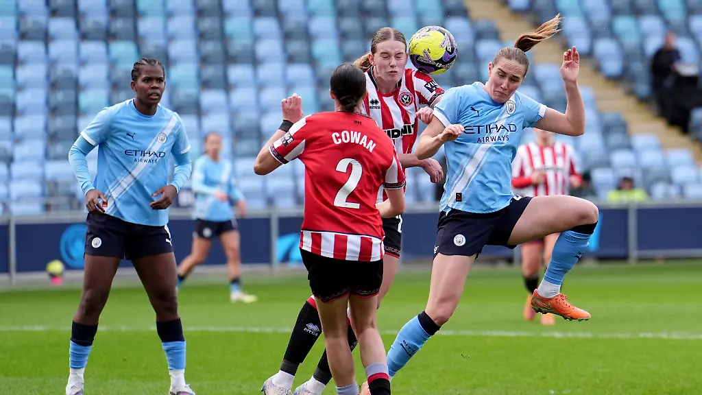 Manchester-City-v-Sheffield-United-Adobe-Women-s-FA-Cup-Joie-Stadium-Manchester-City-s-Sydney-Lohmann-battles-for-the-ball-with-Sheffield-United-s-Simone-Sherwood-during-the-Adobe-Women-s-FA-Cup-match-at-Joie-Stadium-Manchester-Picture-date-Sunday-February-22-2026-Photo-credit-should-read-Martin-Rickett-PA-Wire-RESTRICTIONS-Use-subject-to-restrictions-Editorial-use-only-no-commercial-use-without-prior-consent-from-rights-holder