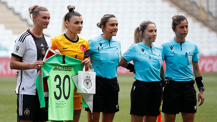 Mit der Botschaft "Wir für dich, Anne!" auf den Aufwärmshirts setzte das DFB-Team ein Zeichen für die erneut an Krebs erkrankte Torhüterin Ann-Katrin Berger. Ohne die Stammkräfte Lena Oberdorf (Infekt), Marina Hegering (Fußverletzung) und Giulia Gwinn (Knieprobleme) lief die deutsche Auswahl danach erstmals im neuen einheitlichen Trikotdesign für Frauen und Männer auf.