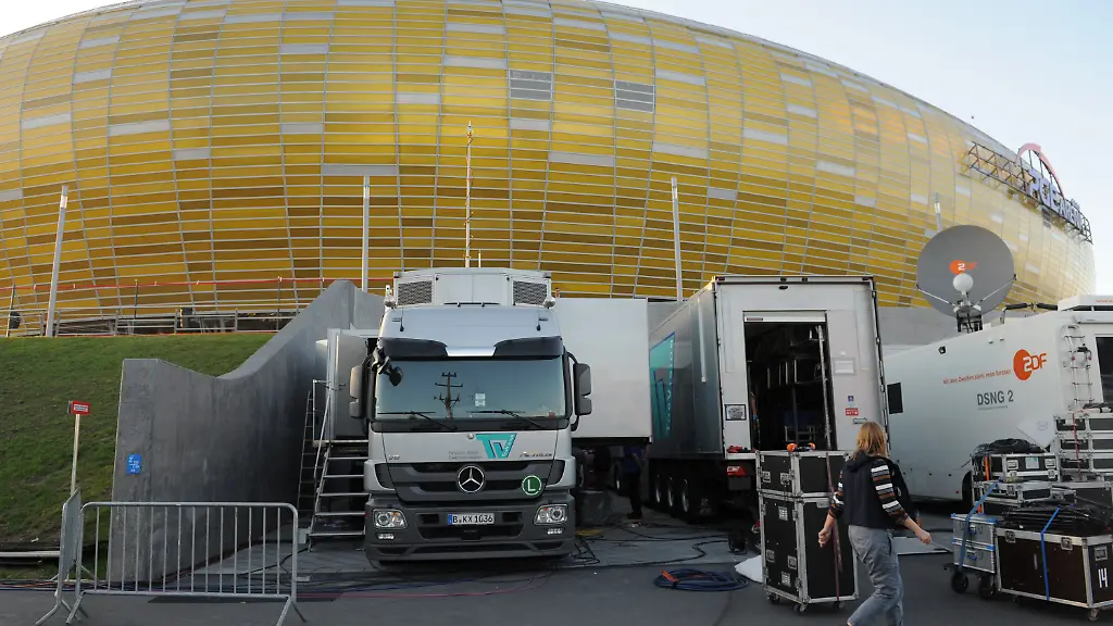 Gar nicht gut da stand der Übertragungswagen in Danzig. Er hatte am Mittag, vermutlich wegen eines Kurzschlusses, Feuer gefangen. Das ZDF musste die Live-Übertragung des Länderspiels daher in Mainz produzieren. Das Team um Moderatorin Katrin Müller-Hohenstein und den gerade erst gelandeten TV-Experten Oliver Kahn war kurzfristig zurück nach Deutschland gereist. Béla Réthy blieb hingegen in Danzig und kommentierte die Partie wie geplant im Stadion.