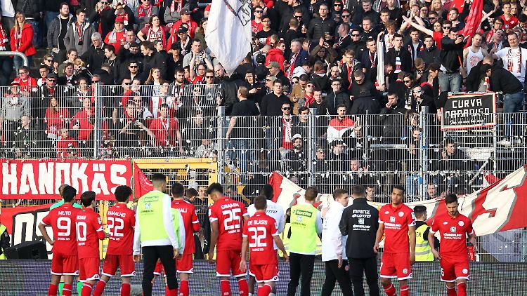 Die Mainzer Profis auf dem Weg zu den eigenen Fans. Die waren not amused nach dem 1:2.