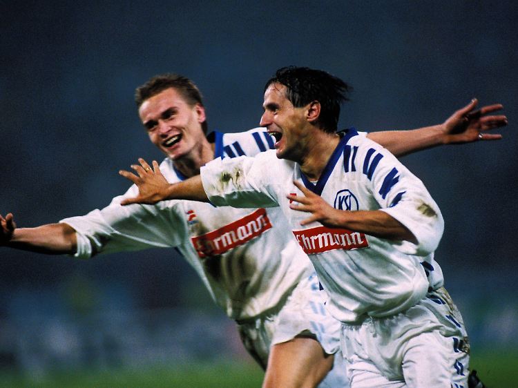 Das Wunder vom Wildpark: Mit 7:0 (3:0) besiegte der KSC am 2. November 1993 in der zweiten Rundes des Uefa-Pokals den FC Valencia. Hier bejubelt Edgar Schmidt, rechts, mit Manfred Bender eines seiner vier Tore an diesem legendären Abend.