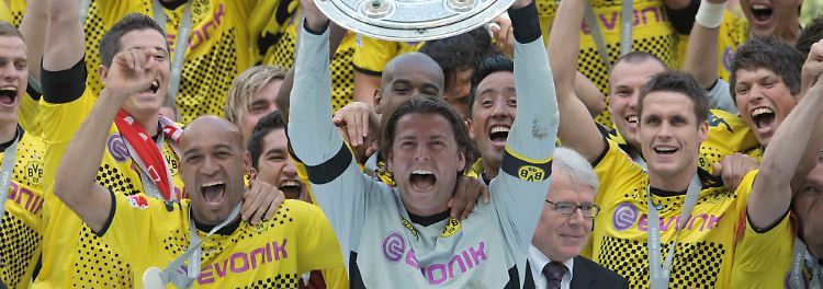 Das hat er Manuel Neuer voraus: Dortmunds Roman Weidenfeller feiert mit der Meisterschale. Aber Manuel Neuer spielte ja auch bis zum Sommer für Schalke 04.