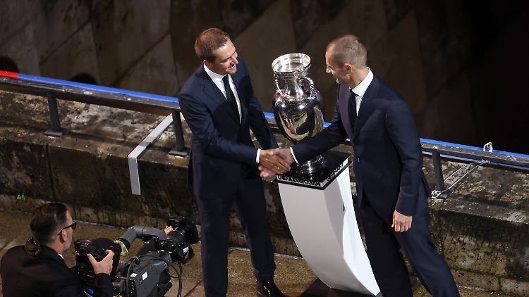 "Was? Die Europameisterschaft ist in Deutschland? Das wusste ich gar nicht", sagt die Wirtin einer Berliner Eckkneipe am späten Dienstag. "Aber gut sieht das Logo schon aus." Dann wendet sie sich wieder ihrem Geschäft zu. Impfzertifikate kontrollieren, Bier zapfen. Ein paar Stunden vorher, um 20.24 Uhr, nimmt UEFA-Präsident Aleksander Ceferin ein paar Stufen am Marathon-Tor des Berliner Olympiastadions, um den Coupe Henri-Delaunay, den EM-Pokal, auf einem Podest zu platzieren.