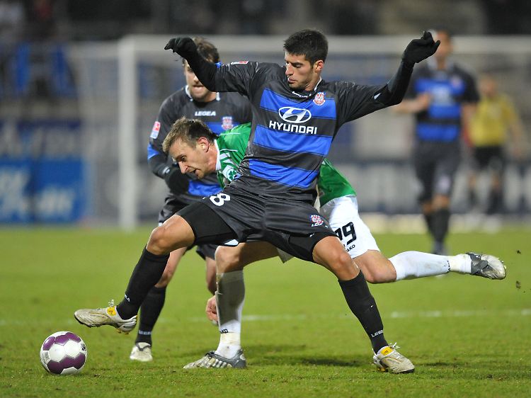 Tanz um den Ball: Der Düsseldorfer Sebastian Heidinger (r) und John Jairo Mosquera (m) aus Berlin kämpfen um den Ball.