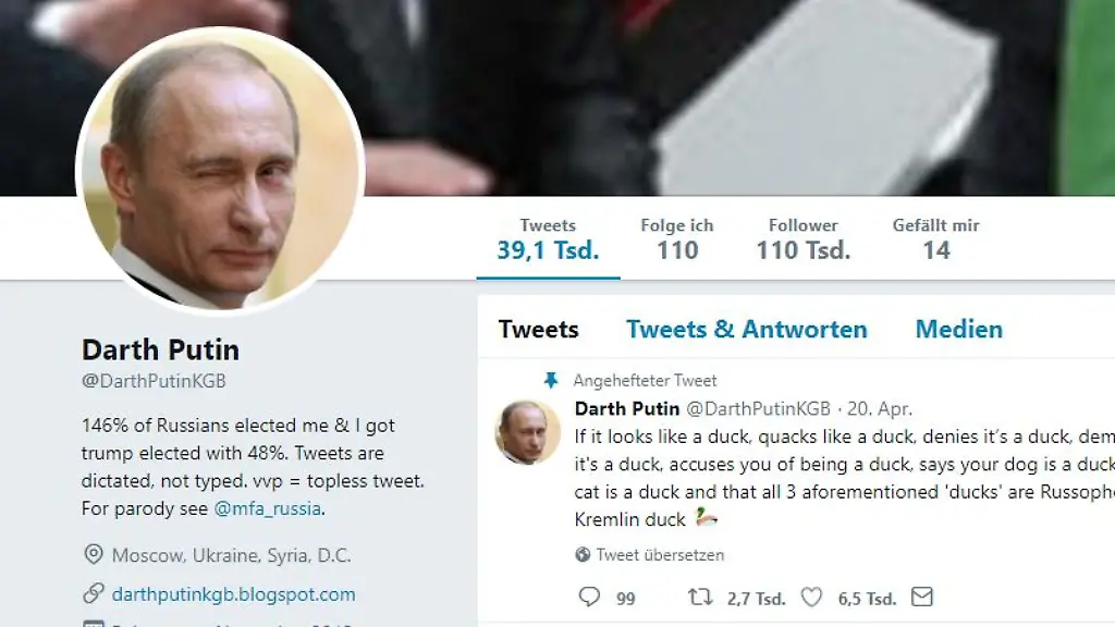 Mehr als 100.000 Menschen haben seine Tweets abonniert, besonders populär sind seine grundsätzlichen Einordnungen zur russischen Desinformationsstrategie, die je nach Nachrichtenlage immer wieder passen. "Glaube nichts, ehe der Kreml es nicht dementiert hat", schreibt Darth Putin dann, oder: "Wir machen keine Propaganda, damit ihr etwas glaubt. Wir machen Propaganda, damit ihr nichts glaubt. Und vor allem, damit ihr nichts tut." Pointiert und kurz, wie gemacht für Twitter.