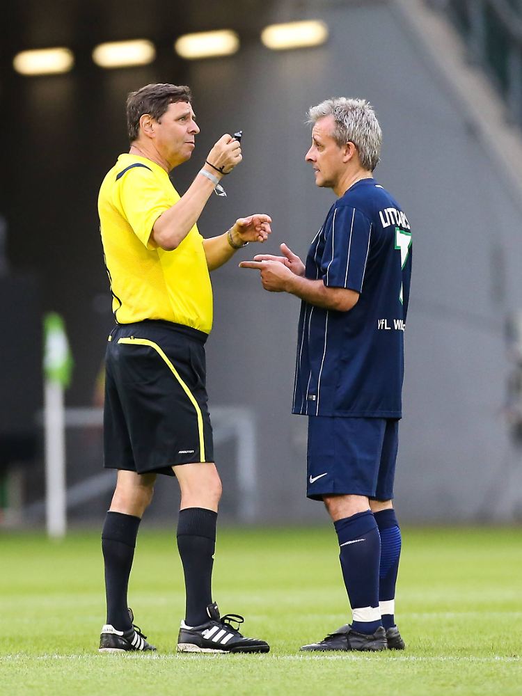 Fachgespräch: Bernd Heynemann erklärt Pierre Littbarski die Regelauslegung.