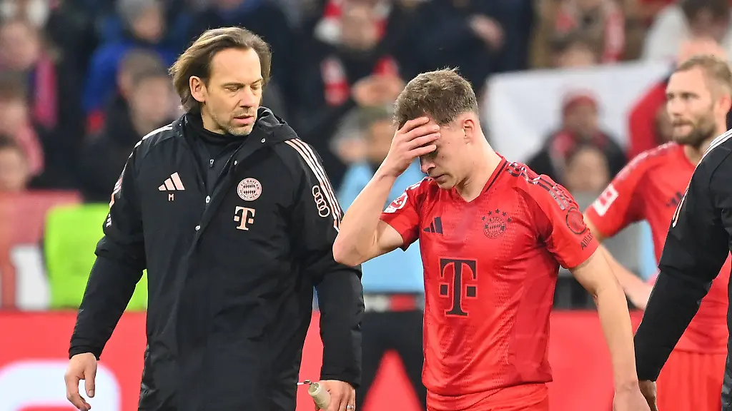 Die Stars des FC Bayern ließen sich nur kurz von ihren Fans feiern - und hakten das Ausrufezeichen im Titelkampf schnell ab. Das, was die Münchner beim deutlichen 4:0 (1:0) gegen den Tabellendritten Eintracht Frankfurt gezeigt hatten, war zwar deutlich "meisterlicher" als zuletzt, doch die große Euphorie brach beim deutschen Rekordmeister nicht aus. Weil der Erfolg von der Sorge um Joshua Kimmich begleitet wurde - und weil das Königsklassen-Duell mit Bayer Leverkusen, das über die Bewertung der Saison entscheiden wird, noch bevorsteht.