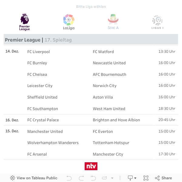 Acht Punkte liegt Leicester, der Sensationsmeister von 2016, hinter Liverpool. Seinerzeit hatte der Klub aus den East Midlands nach 16 Spielen drei Zähler weniger auf dem Konto als jetzt. "Wenn Liverpool nicht so verdammt stark wäre, könnte Leicester wirklich Meister werden", sagte Klub-Legende Gary Lineker. Am Boxing Day, dem zweiten Weihnachtstag, treffen beide Teams dann in Leicester aufeinander.