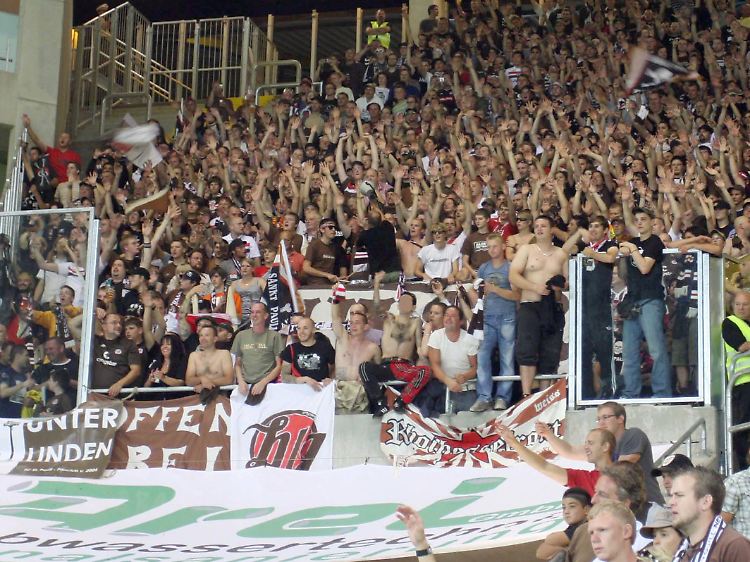 St. Pauli-Fans feiern im neuen Tivoli-Stadion in Aachen den 5:0 Sieg ihrer Mannschaft. In einer rot-schwarzen Hose sitzt der später verunglückte Fan vorne auf der Brüstung.
