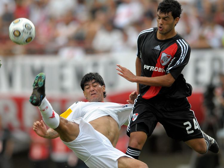 Mit diesen Zweikämpfen kennt er sich aus: Cristian Canio, links, chilenischer Angreifer des argentinischen Erstligisten Tucuman. Das mit den Pistolen findet er nicht so gut.