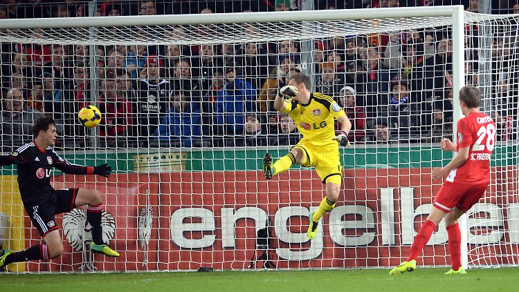Bayer Leverkusen gewann mit 2:1 (1:1) glücklich beim lange Zeit besseren SC Freiburg und steht erstmals seit fünf Jahren wieder in der Runde der besten Acht. Dank eines späten Treffers von Ivica Olic bezwang der VfL Wolfsburg den Zweitligisten FC Ingolstadt 2:1 (0:1), auch Eintracht Frankfurt musste beim 4:2 (1:0) gegen den SV Sandhausen lange zittern.