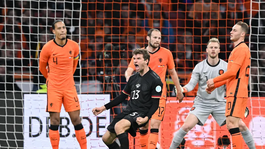Trotz aller Bemühungen boten die Oranje-Abwehrstars um Virgil van Dijk nicht viele Räume. Der Lattentreffer von Timo Werner hätte wegen vermeintlicher Abseitsposition ohnehin nicht gezählt (21.). So brachte erst die letzte Aktion im ersten Durchgang die DFB-Führung. Werner setzte Musiala in Szene. Dessen scharfe Hereingabe klärte Tyrell Malacia in die Mitte, wo Müller mal wieder goldrichtig stand. Mit seinem 43. Länderspiel-Tor zog Müller mit Seeler gleich und liegt nun auf Platz acht der ewigen DFB-Torjägerliste. Deutscher Rekordtorschütze ist Miroslav Klose mit 71 Treffern.