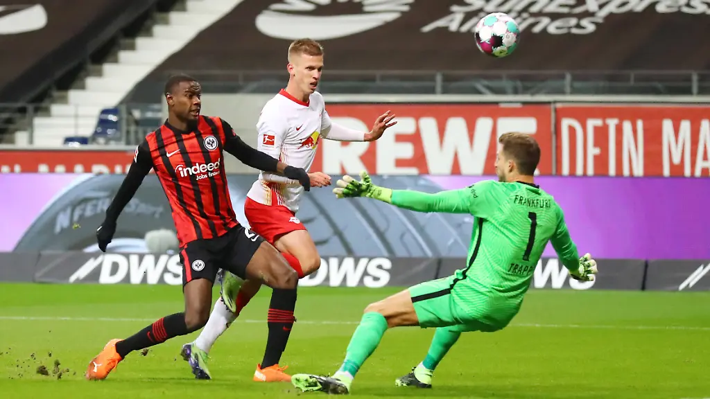 Der Angreifer (4.) tauchte auch gleich bei der ersten Möglichkeit der Leipziger vor dem Tor auf. Die Gäste steigerten anschließend langsam den Druck, legten sich die Frankfurter zurecht und kontrollierten das Geschehen. Bei den Abschlüssen fehlte aber die Entschlossenheit. Amadou Haidaras (6.) Schuss wurde geblockt, Dani Olmo (15.), der die DFB-Elf mit Spanien unter der Wochen gedemütigt hatte, lupfte drüber.