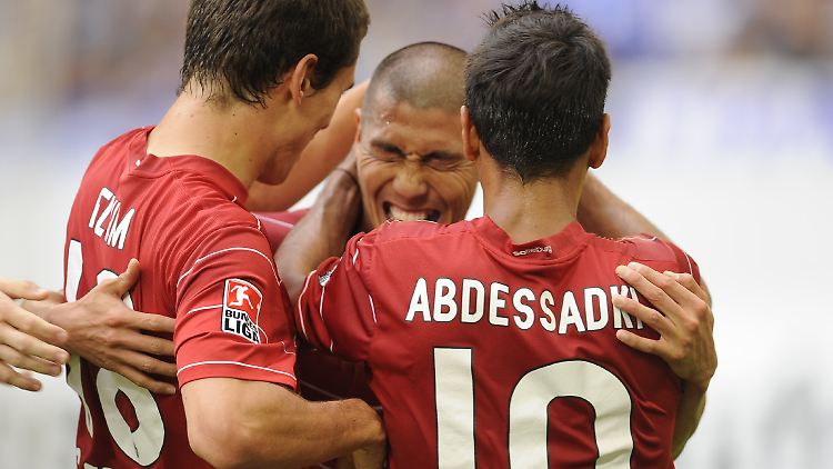 Drei Breisgauer auf Schalke: Die Freiburger Johannes Flum, links, und Yacine Abdessadki jubeln nach dem 0:1 mit dem Torschützen Du-Ri Cha.