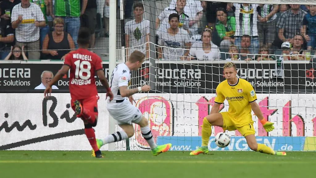 Die beste Gelegenheit für Bayer vergab erneut Tah, der mit einem Kopfball nur die Querlatte traf (41.). Zuvor scheiterte Karim Bellarabi (33.) mit einem Rechtsschuss an Gladbachs Keeper Yann Sommer. Kurz darauf hatte dann Hahn den Führungstreffer für die Gastgeber auf dem Fuß, doch Leno war auf dem Posten. In der Nachspielzeit der ersten Halbzeit gelang Hahn nach einem langen von Tah abgefälschten Pass dann das 1:0 für die Gladbacher. Es war der 1000. Auswärts-Gegentreffer in der Leverkusener Bundesligageschichte.