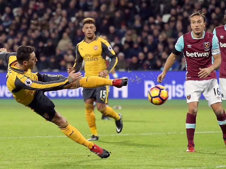 Auf den zweiten Platz schob sich der FC Arsenal (31 Zähler) auch dank eines Tores von Weltmeister Mesut Özil nach vorne. Im Londoner Derby bei West Ham United behielten die Gunners mit 5:1 (1:0) die Oberhand. Der ehemalige Real-Star Özil traf in der 24. Minute, Alexis Sanchez (72./80.) und Alex Oxlade-Chamberlein (84.) legten nach. Für West Ham traf Andy Carroll (83.). Der FC Liverpool mit Coach Jürgen Klopp kann die "Gunners" mit einem Sieg beim AFC Bournemouth am Sonntag (14.30 Uhr) wieder von Platz zwei verdrängen und bis auf einen Punkt zu Chelsea aufschließen.